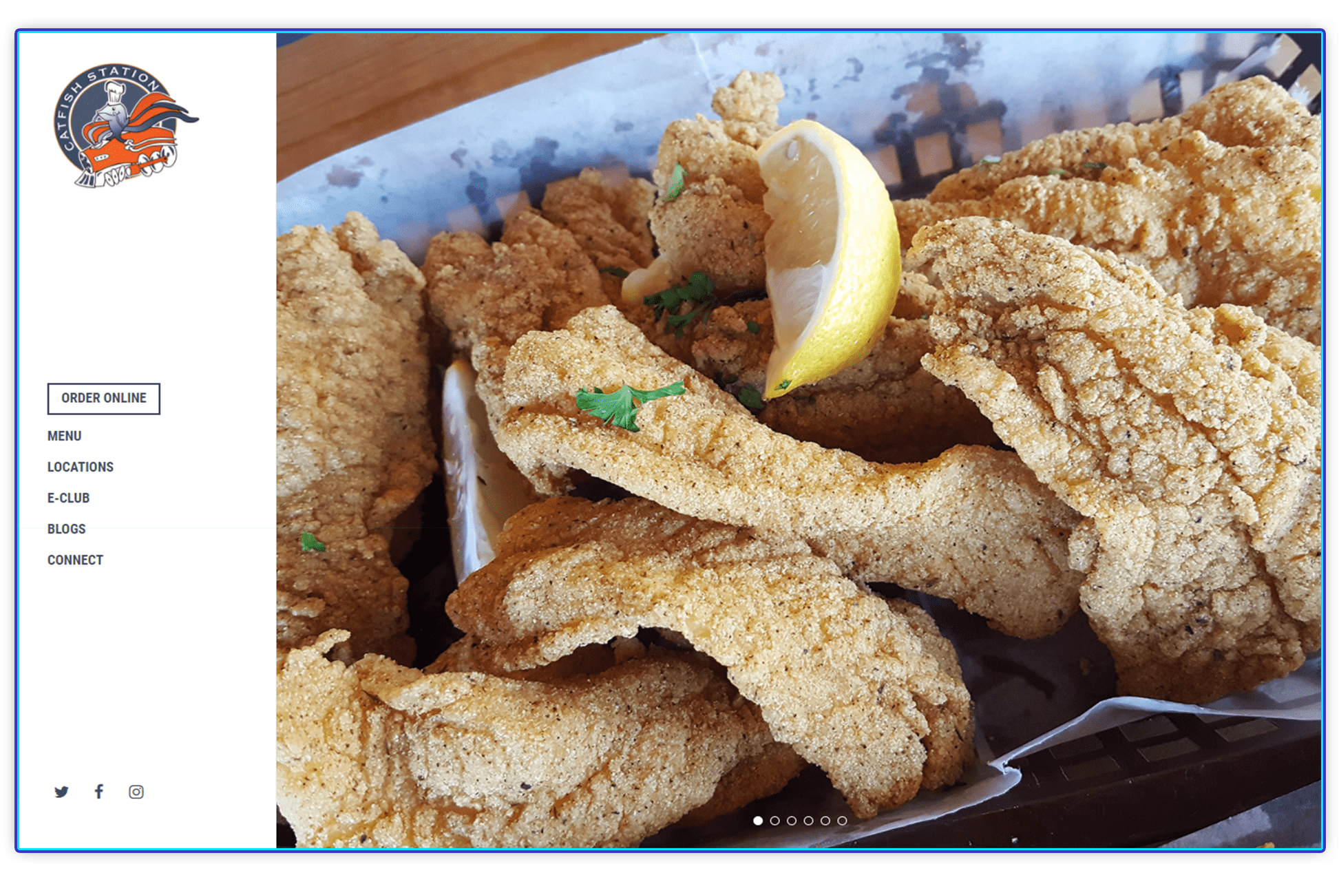 We designed the Catfish Station website in 2017 with the aim of making navigation simple for the end user. The minimalist design gave the customer the ability to find what they needed easily and at all times while marketing the quality of the food. When customers visit a restaurant website they are mainly looking for two things: location information and a menu. Both items were easy to find and accessible from a static, left justified menu.